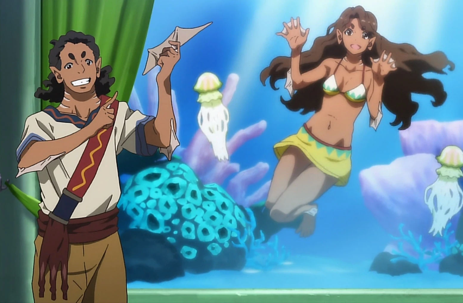 Ragnans (ラグナ人 Raguna-jin) are natives of the planet Ragna. They are amphibious humanoids, roughly as agile as humans on land (where they spend most of the time), but they can move quicker and breathe underwater. Their main distinguishing features compared to humans are the gills that run along their necks near the shoulders, fins that extend from about the elbows and webbed digits.