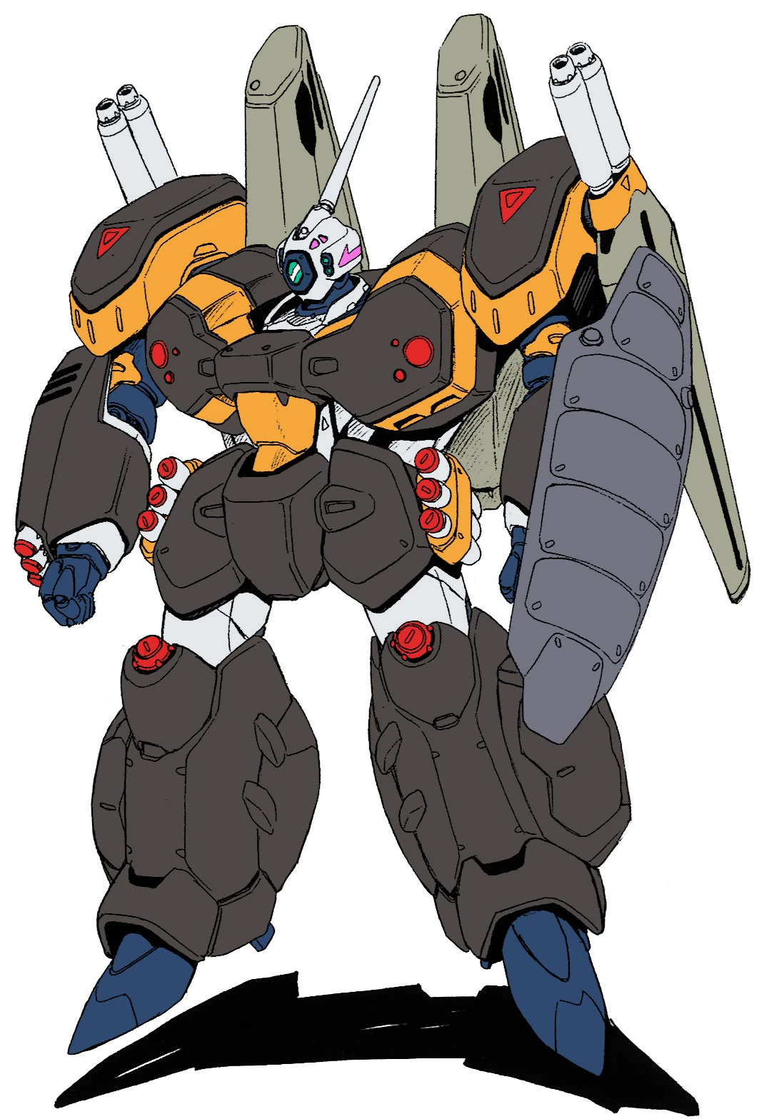 One of many specialized equipment developed for VF-11 Thunderbolt series, that focused on defense and firepower aspect for ground combat mission, called "APS-11 Protect Armor Pack".[2] This particular equipment is developed mainly from VF-0 Phoenix's "PWS-0X Reactive Armor", which its design inherited a lot of elements from its predecessor, such as the shield, chest, arms, legs, and its projectile resistance.[3] While the reactive shield looks like the VF-0 counterpart, it was larger and covering the VF-11's shield underneath it.[4] In addition, it also equipped with a pair large booster unit superior to the standard VF-11 Super Packs, mounted on its back, gave it extra mobility for the VF-11, and still remains even if the armor unit have been purged.[5] In terms of its firepower it was equipped with a large amount of HMMM-Mk 6 micro missiles, mounted on each shoulder, chest, and leg units.[2] In Addition it also equipped with 2-barelled twin beam cannon mounted on its shoulders, and grenade racks mounted on the hips. For ranged combat its equipped with a six-barelled Long Gunpod, that cannot be manually reloaded due to its large size.[2] Because of this, the APS-11 Protect Armor gave the VF-11 an impressive defensive capabilities, that can withstand Variable Fighter (VF) gunpod projectiles and barrage of missiles. In addition, the large amount of missiles also make it useful to takedown large amount of target simultaneously, especially during fleet battle. Despite its impressive features, it was difficult to handle by ordinary pilot, and costly to make, which is make it only produced in limited number.